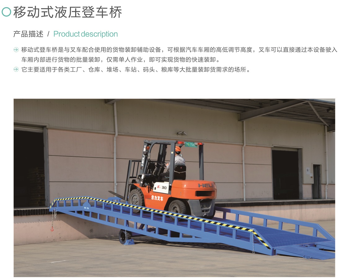 移動(dòng)式登車橋是與叉車配合使用的貨物裝卸輔助設(shè)備,可根據(jù)汽車車廂的高低調(diào)節(jié)高度,叉車可以直接通過本設(shè)備駛?cè)胲噹麅?nèi)部進(jìn)行貨物的批量裝卸,僅需單人作業(yè),即可實(shí)現(xiàn)貨物的快速裝卸。